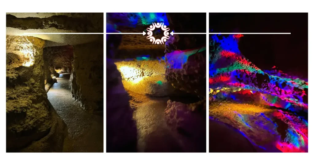 We visited during Cave of Lights, which runs from Thanksgiving through the end of January. The cave is decorated with subtle holiday lights that highlight the cave formations, mineral textures, and even tiny water droplets that naturally collect along the ceiling. The lights sparkle off the cave walls and (in our experience) really help kids stay engaged as you walk through.